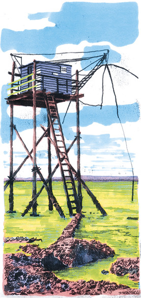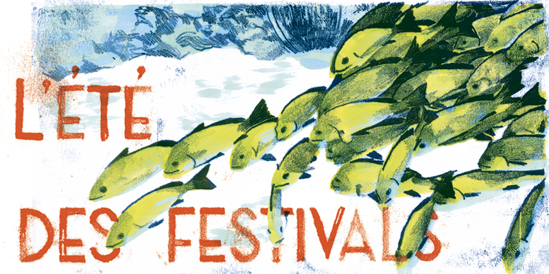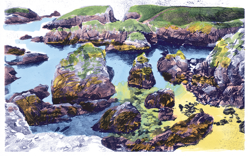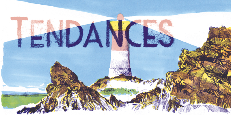 Direction la côte pour le Kostar d’été. « Une évidence. Je voulais quelque chose de léger, j’avais envie de plages, de bord de mer, comme dans ces vieilles cartes postales noir et blanc années 30, un peu colorisée dans des tons flashy. » Celle qui dessine depuis toujours et ne se sépare jamais de son carnet de croquis avait donc fait des repérages. « Ensuite, je continue le voyage dans mon atelier en réinterprétant les paysages. » Chacun pourra s’amuser à les reconnaître car ils existent tous. Audrey s’en tient à trois couleurs phares : bleu, jaune fluo et un rose saumon. « Comme en sérigraphie, la superposition m’en révèle d’autres et le monotype vient renforcer le contraste avec le noir. » Curieuse de tout, passionnée, Audrey Caron souhaite partager et transmettre. Alors, elle donne des cours, anime des ateliers. Elle se projette dans un nouvel atelier pour de nouvelles collaborations en collectif. Et l’aventure s’annonce belle.